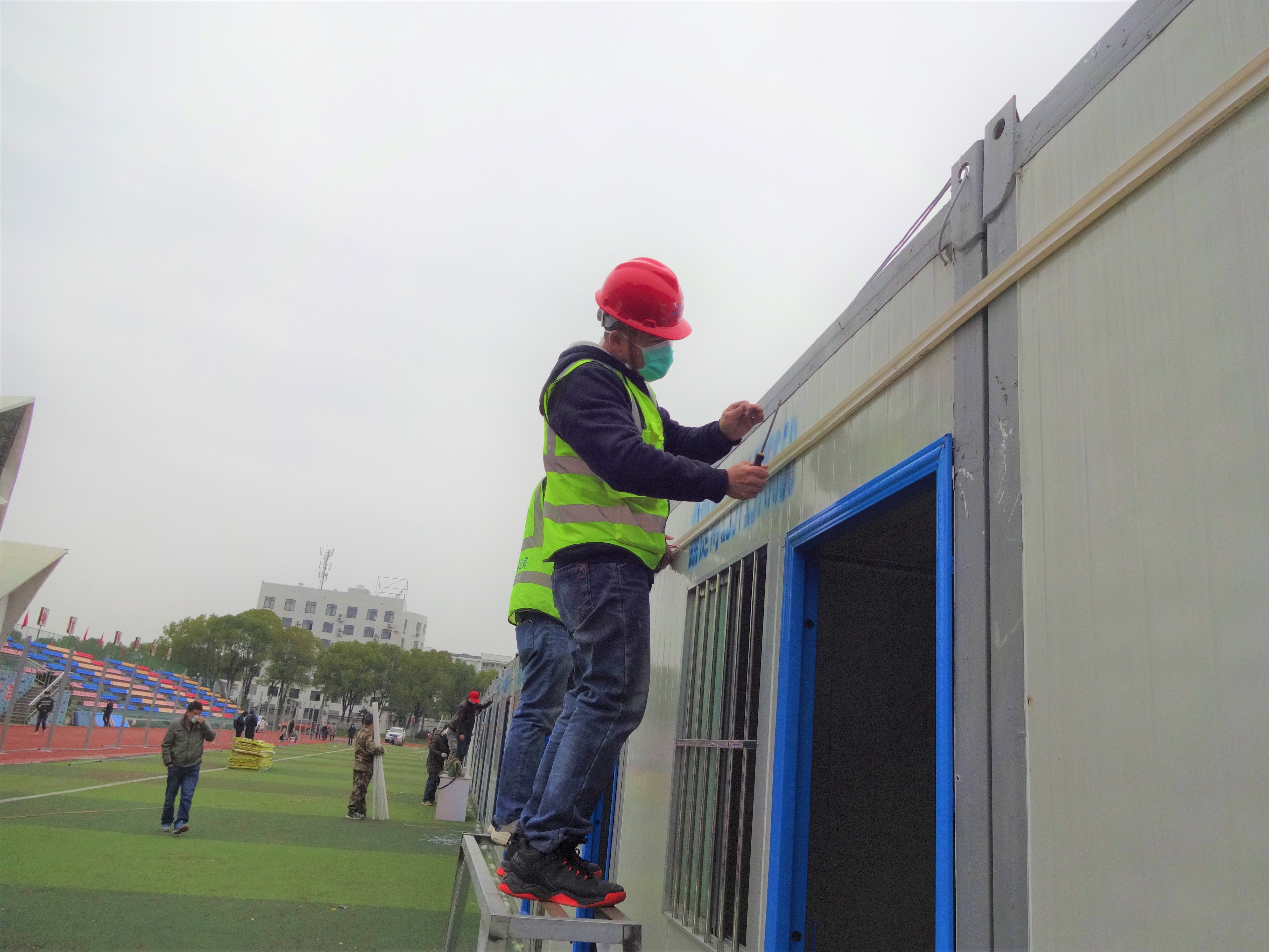 3月1日晚接到建設任務后,漢陽市政黨委書記、董事長嚴悌文,總經(jīng)理虞志鵬,常務副總經(jīng)理王智高連夜組建施工專班,親赴現(xiàn)場進行考察并確定施工方案。當晚,項目人員組織材料進場直至凌晨1點,最終從40公里以外的漢陽開發(fā)區(qū)將木芯板、門板、鋼立柱、焊接方管等施工材料全部運送進場。漢陽市政致遠公司、博宏公司共計投入40余名管理人員、300余名工人參與施工。經(jīng)過緊鑼密鼓的籌備工作,現(xiàn)場施工有序進行,板房吊裝、隔斷安裝、水電、化糞池均同步進行施工。