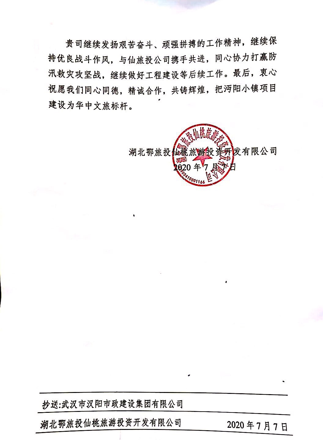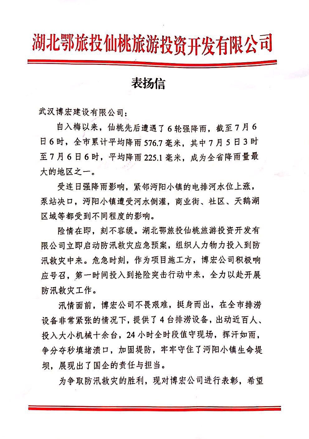 ? ? ? 2020年7月7日,鄂旅投仙桃公司給博宏建設(shè)送來(lái)表?yè)P(yáng)信,感謝博宏公司在汛情面前,不畏艱險(xiǎn)挺身而出,為沔陽(yáng)小鎮(zhèn)筑起生命之堤。