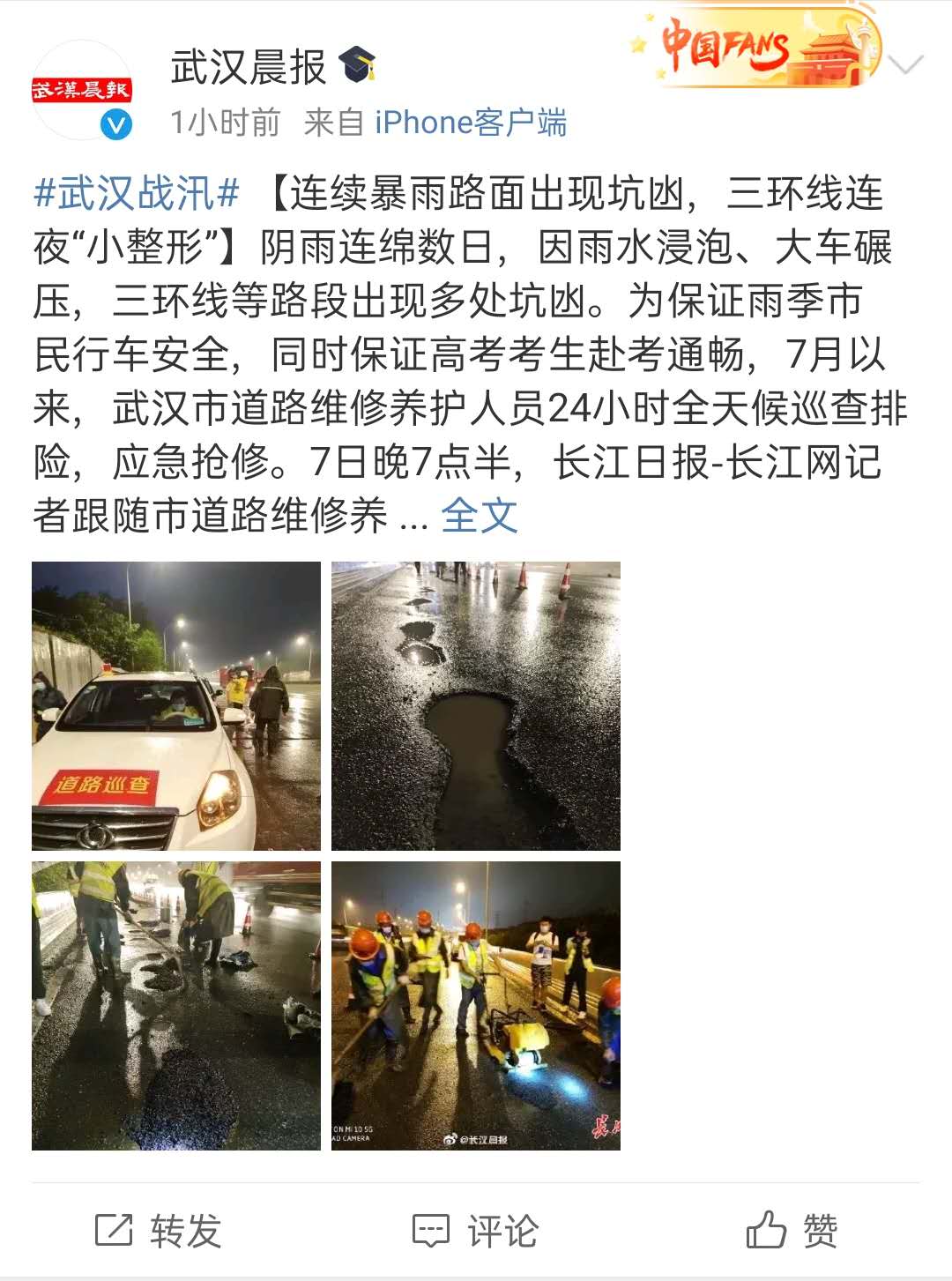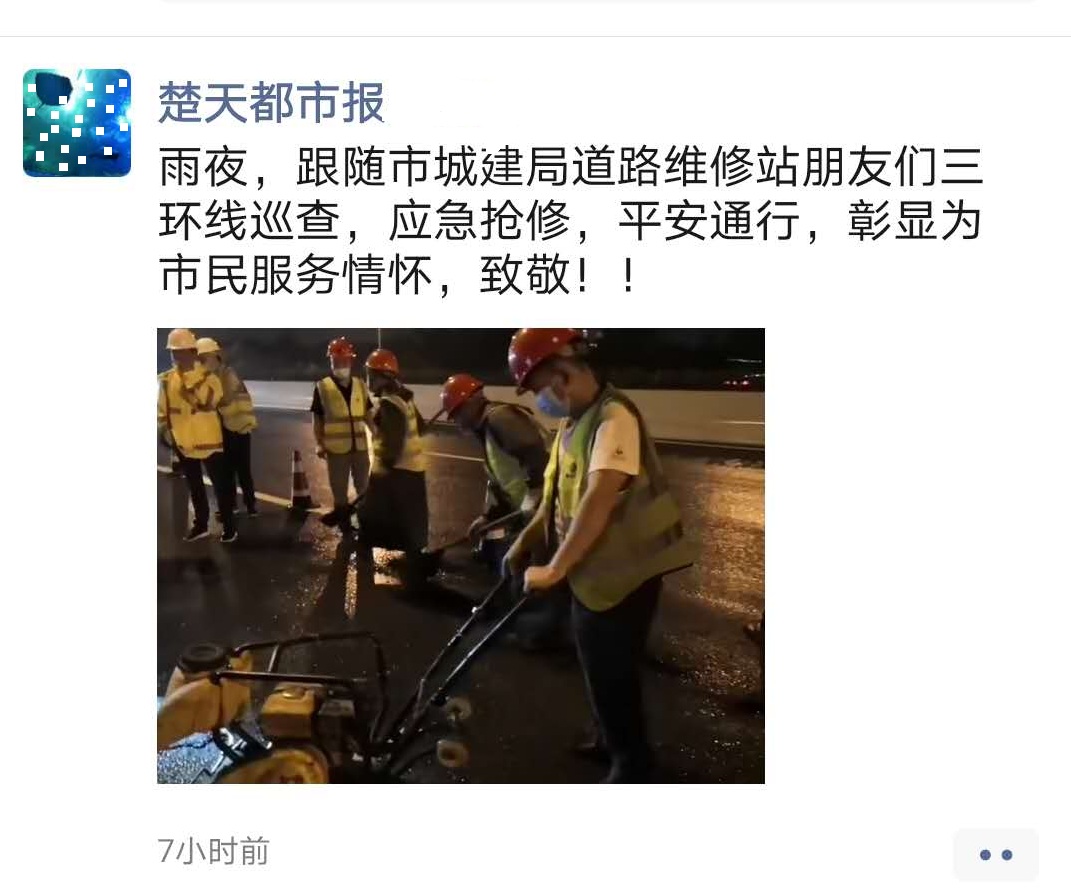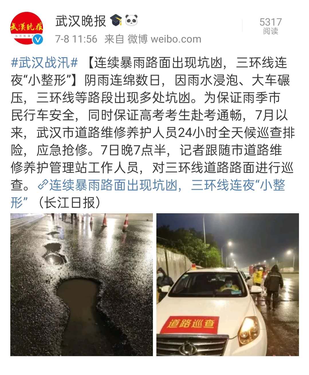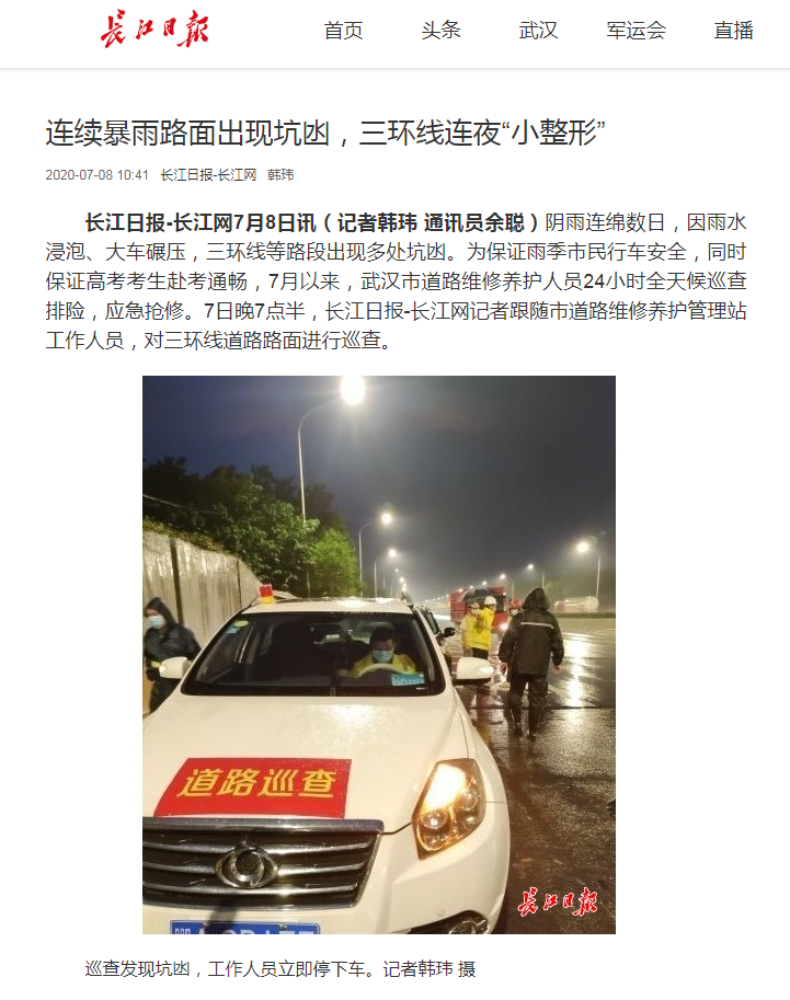 ? ? ? 近日,武漢市陰雨連綿,許多路段因雨水浸泡、車輛碾壓等出現(xiàn)坑凼,嚴重影響了交通安全。為保障雨季市民行車安全,助力高考考生赴考通暢,7月以來,漢陽市政六公司24小時全天候巡查排險,提前預(yù)防、提前搶修,積極修復(fù)受損路段,做到應(yīng)急搶修不斷檔,獲得了民眾的一致好評,并被《長江日報》《武漢晨報》《武漢晚報》《楚天都市報》等主流媒體報道。