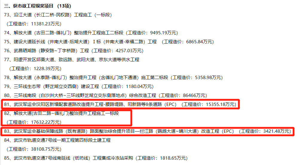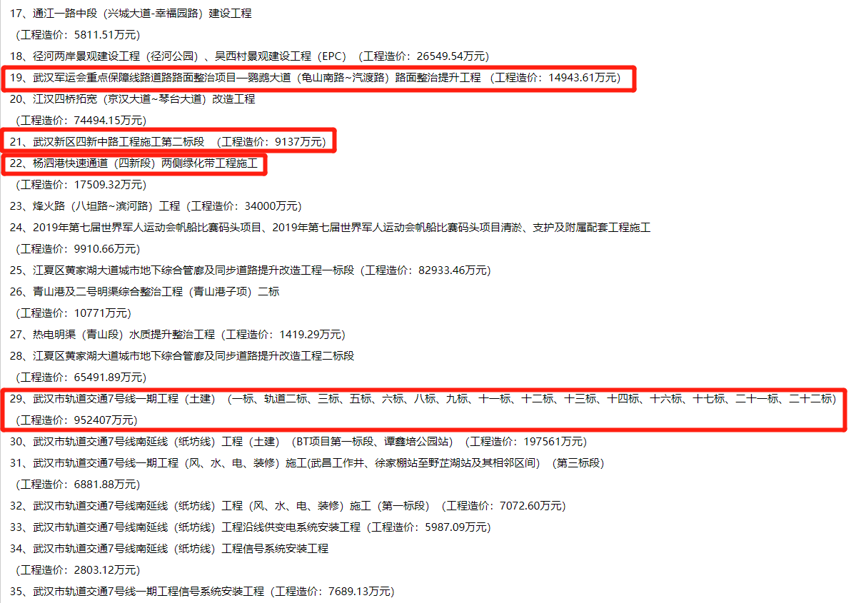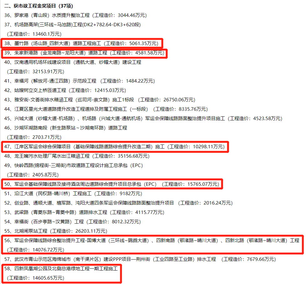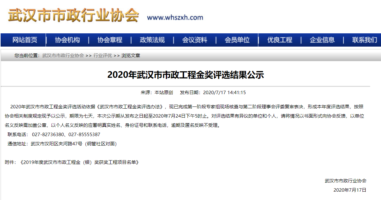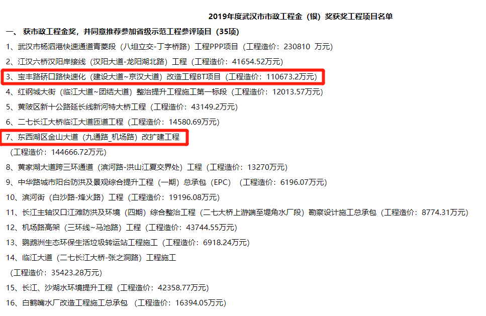 2019年武漢市市政工程金獎(jiǎng)入選工程項(xiàng)目名單公示