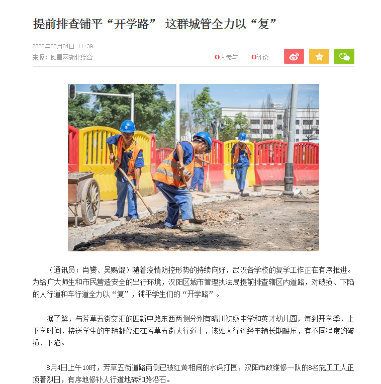 ? ? ? 近日,漢陽市政維修一隊(duì)負(fù)責(zé)的漢陽區(qū)內(nèi)日常道路維修工作,先后受到漢陽知音、鳳凰網(wǎng)湖北綜合、長(zhǎng)江日?qǐng)?bào)等主流媒體的一致好評(píng)。此前,漢陽市政維修一隊(duì)道路維修工作也曾多次獲媒體正面報(bào)道。
