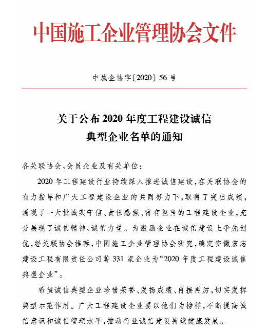 ? ? ? 2020年工程建設行業(yè)持續(xù)深入推進誠信建設,廣泛開展行業(yè)信用評價工作。近日,中國施工管理協(xié)會公布了“2020年度第一批工程建設企業(yè)信用評價”和“2020年度工程建設誠信典型企業(yè)”名單,漢陽市政多個公司獲評榮譽。