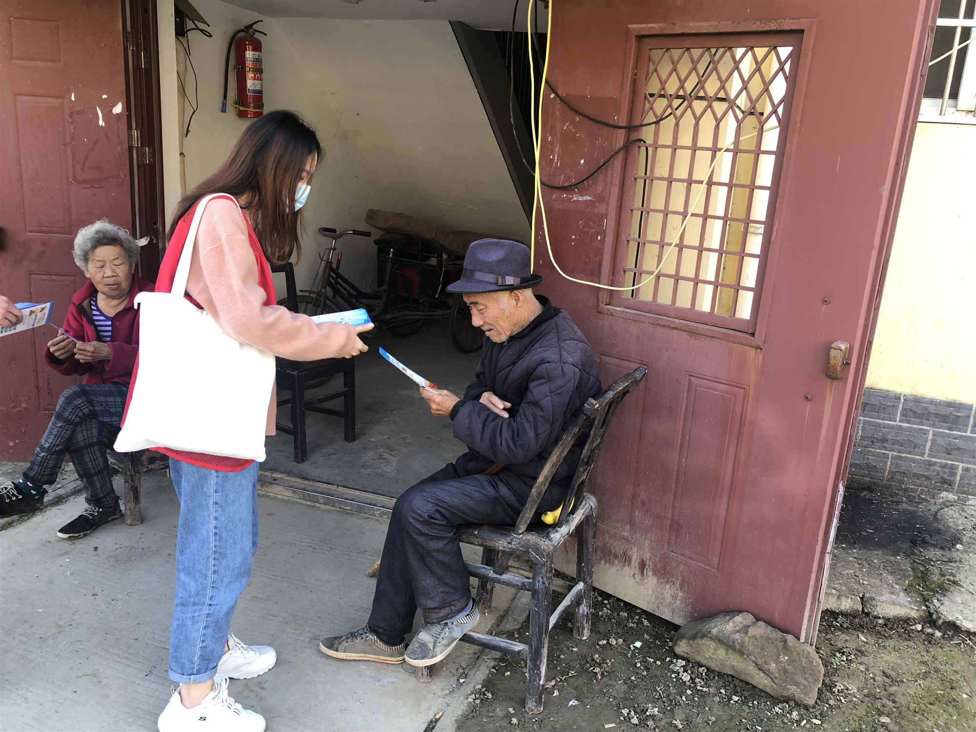 (黨員為社區(qū)居民發(fā)放民法典宣傳冊)