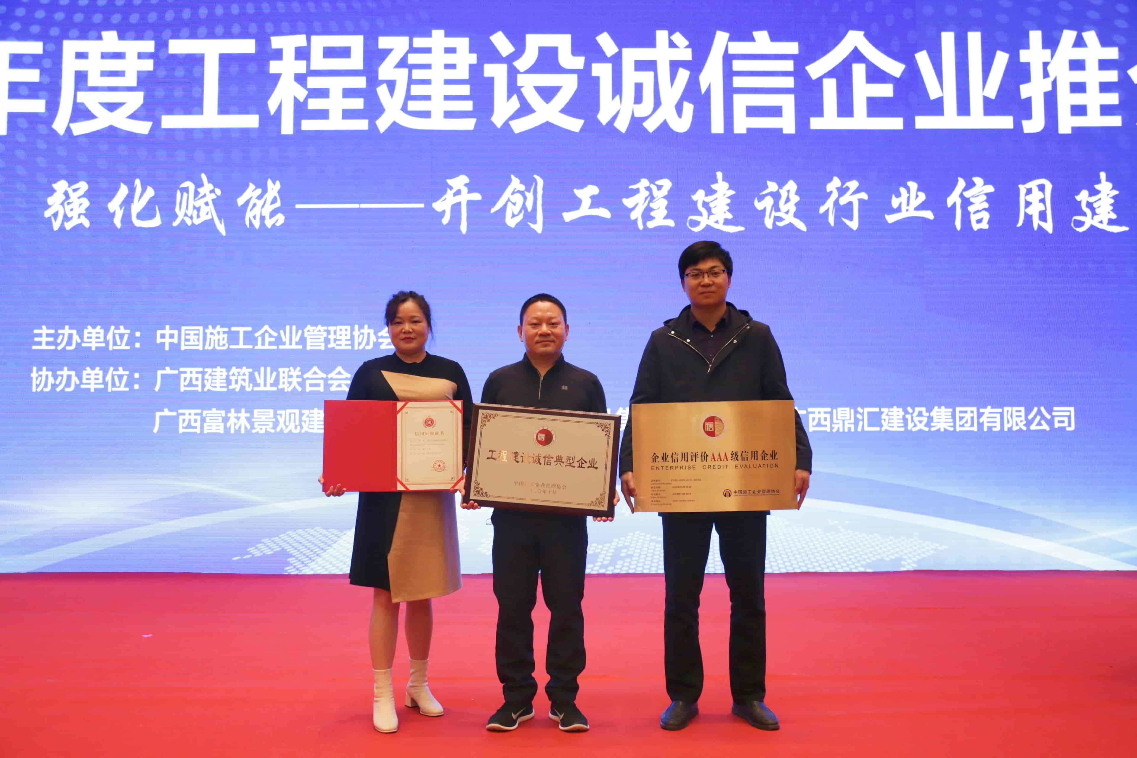 ? ? ? 12月4日,中國(guó)施工企業(yè)管理協(xié)會(huì)在廣西南寧召開(kāi)“2020年度工程建設(shè)誠(chéng)信企業(yè)推介大會(huì)”。漢陽(yáng)市政、漢陽(yáng)市政天創(chuàng)公司、漢陽(yáng)市政博宏公司榮獲“2020年度工程建設(shè)誠(chéng)信典型企業(yè)”“信用星級(jí)企業(yè)”“AAA信用等級(jí)企業(yè)”3項(xiàng)榮譽(yù),為集團(tuán)企業(yè)信用獎(jiǎng)項(xiàng)開(kāi)創(chuàng)了新篇章。?