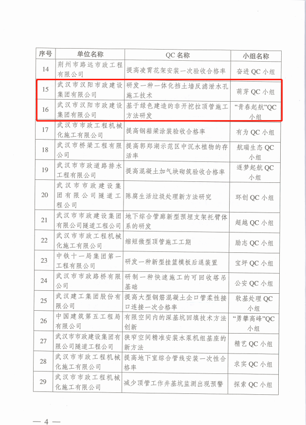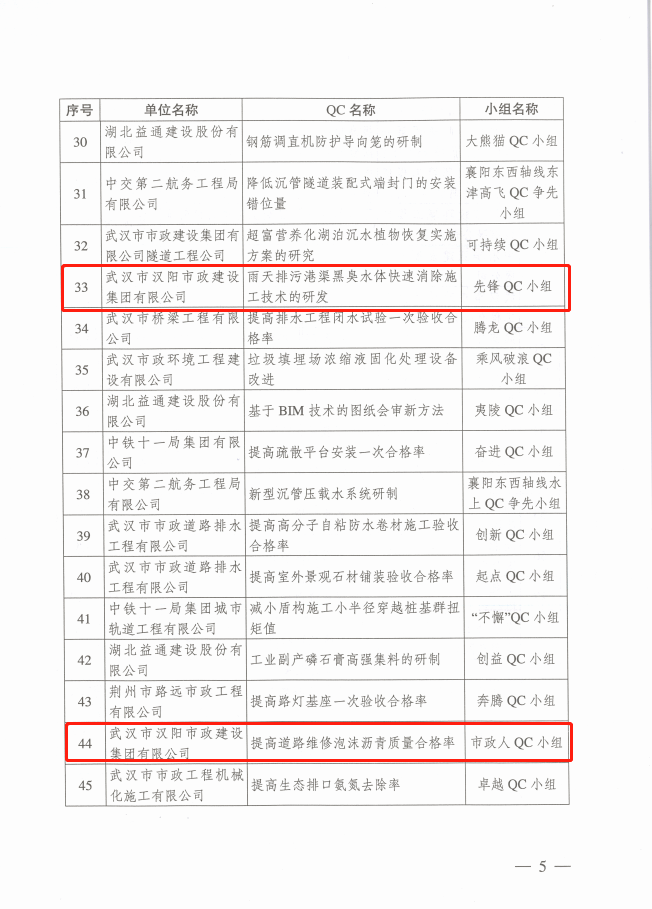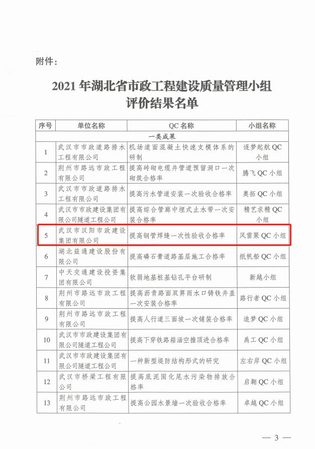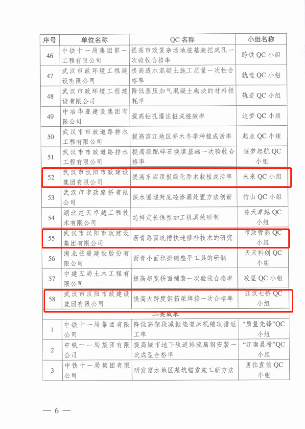 近期,湖北省市政工程協(xié)會傳來捷報,漢陽市政選送的QC成果在激烈的角逐中脫穎而出,喜獲QC成果一等獎8項、二等獎18項、三等獎6項。