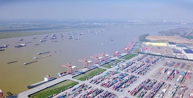 航拍長江上貨船往來,碼頭上集裝箱擺放有序(來源:新華網(wǎng))