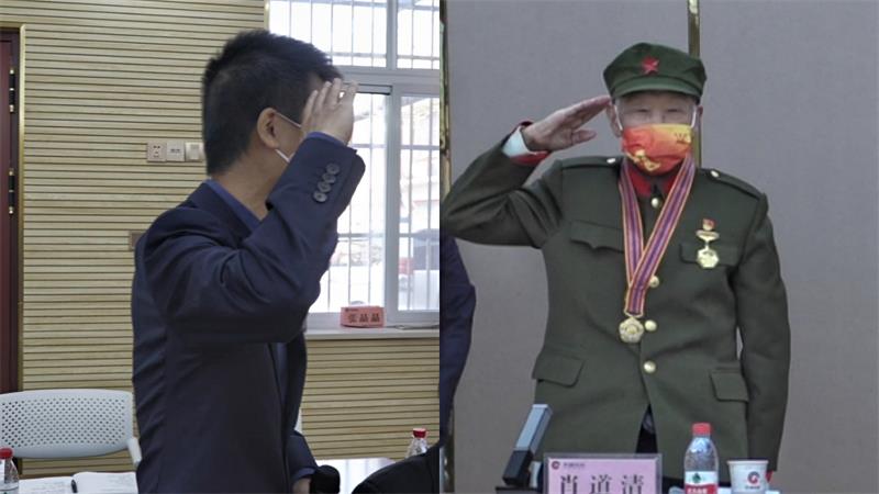 在熱烈的掌聲中,肖道清深情地講起自己在抗美援朝前線作戰(zhàn)的經(jīng)歷。16歲的他積極響應(yīng)國家號召,從武漢奔赴東北,到有“人民空軍的搖籃”之稱的東北民主聯(lián)軍航空學(xué)校進(jìn)行學(xué)習(xí),光榮地成為一名空軍塔臺的指揮員,與戰(zhàn)友跨過鴨綠江,一起爬冰臥雪、在零下三十多度的戰(zhàn)場上,枕戈待旦、奮勇搏殺。說到最后,肖道清激動地舉起手,敬了一個(gè)標(biāo)準(zhǔn)的軍禮。