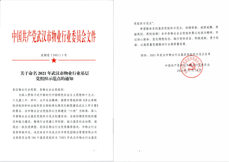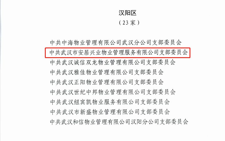 近日,中共武漢市物業(yè)行業(yè)委員會(huì)公布《2021年武漢市物業(yè)行業(yè)基層黨組織示范點(diǎn)名單》,漢陽(yáng)市政安居興業(yè)公司黨支部名列其中。經(jīng)各區(qū)物業(yè)行業(yè)黨委推薦報(bào)送,武漢市物業(yè)行業(yè)黨委審核評(píng)定,全市共有186個(gè)基層黨組織被命名為“2021年武漢市物業(yè)行業(yè)基層黨組織示范點(diǎn)”。