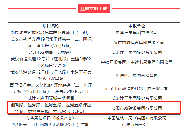 近日,由楚天都市報、武漢建筑業(yè)協(xié)會、武漢市建筑行業(yè)工會聯(lián)合會聯(lián)合主辦的2021年“創(chuàng)領智控杯”江城“雙十大”選樹結果揭曉,漢陽市政高新三路(三環(huán)線-外環(huán)線)改造提升工程總承包(EPC)獲評“江城十大智慧工地”,創(chuàng)智路、徑河路、徑河五路、徑河五路跨徑河橋、黃獅海東路工程總承包(EPC)獲評“江城文明工地”,武漢市軌道交通19號線工程第五標段土建工程獲評“江城優(yōu)秀智慧工地”。