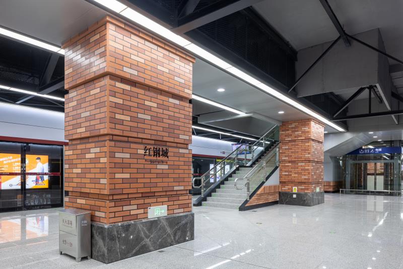 紅鋼城站以“紅城歲月”為主題,從紅鋼城的原始風(fēng)貌入手,車站立柱提取“紅房子”紅磚元素,采用仿紅磚質(zhì)感的高強(qiáng)纖維板進(jìn)行仿制,墻面還原老建筑形態(tài),上下采用紅色仿制磚,中間區(qū)域采用灰色的高強(qiáng)纖維水泥板,以打造懷舊的老武漢歲月感。車站照明燈具設(shè)計(jì)結(jié)合了極富工業(yè)元素的工礦燈,旨在將地鐵空間融入周邊環(huán)境,凸顯老武漢的街景特色。