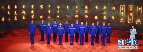 中船重工第七六〇研究所抗災(zāi)搶險英雄群體中的14位同志(另外3位同志犧牲)參加發(fā)布儀式(9月11日攝)。新華社記者 李賀攝
