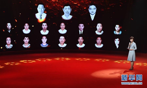 在主持人(右一)的引導(dǎo)下,中船重工第七六〇研究所抗災(zāi)搶險英雄群體中的14位同志(另外3位同志犧牲)參加發(fā)布儀式(9月11日攝)。新華社記者 李賀攝