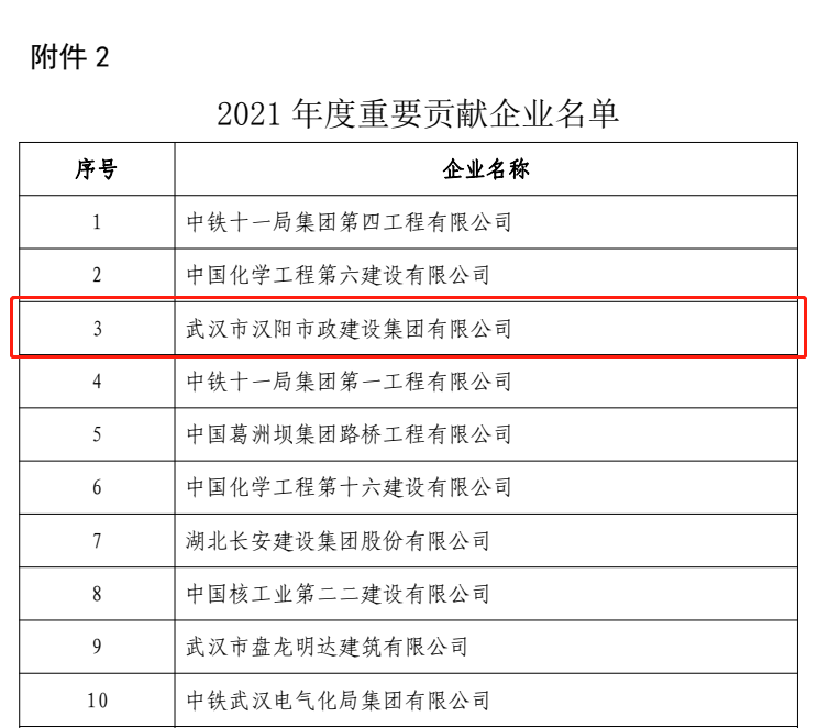 ? ? 3月15日,湖北省住建廳公布115家優(yōu)秀建筑業(yè)企業(yè)名單,揭曉2021年度突出貢獻(xiàn)企業(yè)和重要企業(yè)評(píng)選結(jié)果,漢陽(yáng)市政獲評(píng)“2021年度重要貢獻(xiàn)企業(yè)”,獲通報(bào)表?yè)P(yáng)。