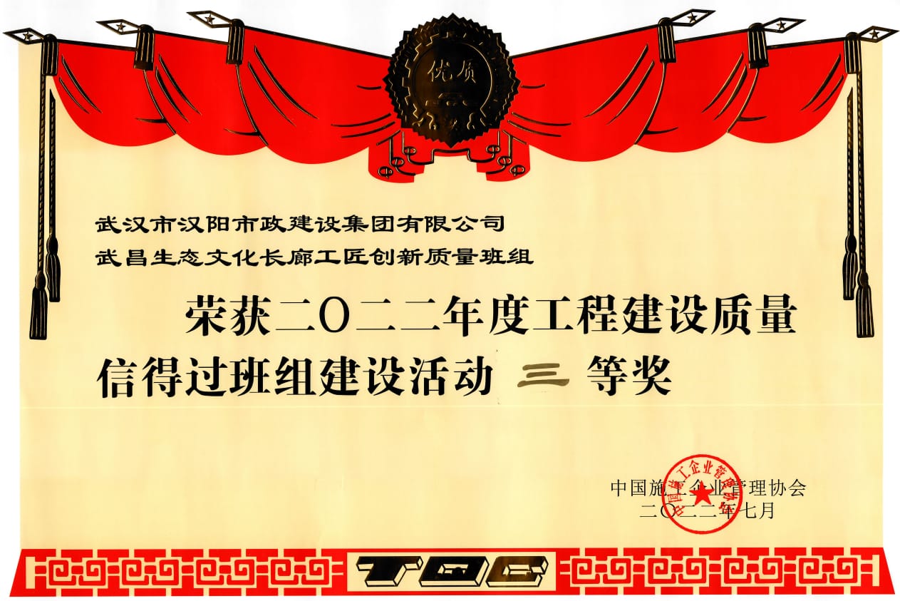 近日,中國施工企業(yè)管理協(xié)會公布了2022年工程建設優(yōu)秀質量信得過班組名單,漢陽市政首次參加此類活動,申報的3個成果均獲得獎項。其中,三公司“武漢博宏建設集團有限公司裝修班組”和七公司“當陽沮河一橋實干建設班組”榮獲二等班組獎項;二公司“武昌生態(tài)文化長廊工匠創(chuàng)新質量班組”榮獲三等班組獎項。