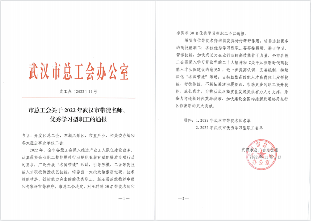 師徒結(jié)對傳匠心,青藍相接鑄輝煌。2022年11月8日,根據(jù)武漢市總工會辦公室發(fā)布的《市總工會關(guān)于2022年武漢市帶徒名師、優(yōu)秀學(xué)習(xí)型職工的通報》,漢陽市政羅明飛、李子豪、陳文獲評“武漢市帶徒名師”,林志剛、易曉輝獲評“武漢市優(yōu)秀學(xué)習(xí)型職工”。