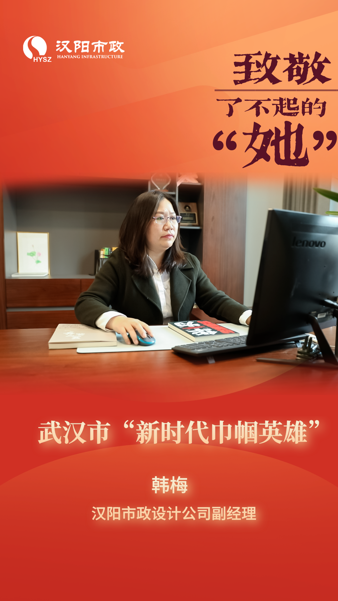 ? ? 韓梅,女,武漢市民建漢陽(yáng)區(qū)工委委員,高級(jí)工程師,2011年7月入職漢陽(yáng)市政,現(xiàn)任設(shè)計(jì)公司副經(jīng)理。從業(yè)12年來(lái),她始終以飽滿的熱情、敬業(yè)的精神、執(zhí)著的堅(jiān)守,把巾幗的動(dòng)人風(fēng)采閃耀在崗位陣地上,詮釋著使命與擔(dān)當(dāng)。