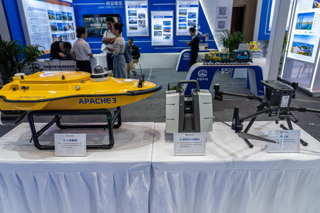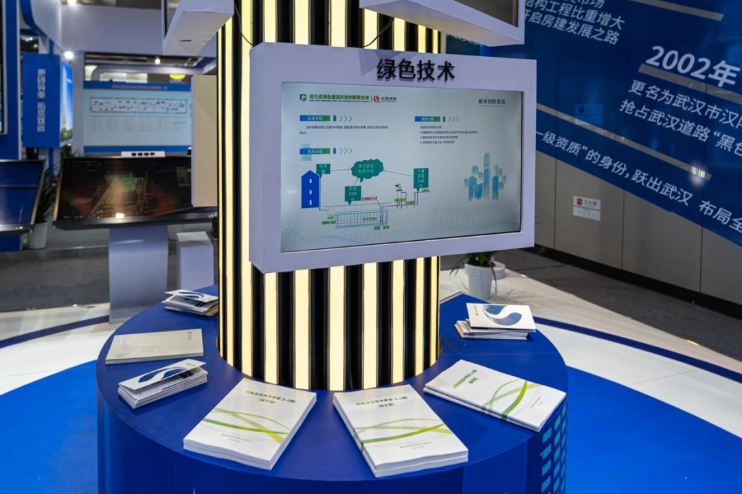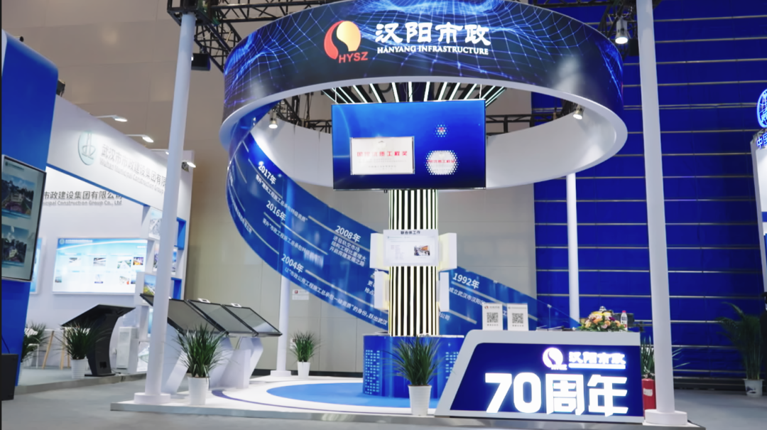 漢陽(yáng)市政展區(qū)以綠色建造、智能建造為主題,分享集團(tuán)數(shù)字化轉(zhuǎn)型的成果。本次展覽告別傳統(tǒng)展陳形式,以漢陽(yáng)樹為靈感,樹冠處連接飄帶,增添靈動(dòng)感,大面積采用科技藍(lán)、白色來(lái)點(diǎn)綴,營(yíng)造不一樣的活力氛圍。展區(qū)以漢陽(yáng)樹為中心,展示了公司70年發(fā)展歷程、取得的重點(diǎn)業(yè)績(jī)和榮譽(yù)獎(jiǎng)項(xiàng)、聯(lián)合體工作、綠色技術(shù)、綠色產(chǎn)業(yè),以及企業(yè)數(shù)字化轉(zhuǎn)型、CIM基礎(chǔ)平臺(tái)建設(shè)等內(nèi)容。